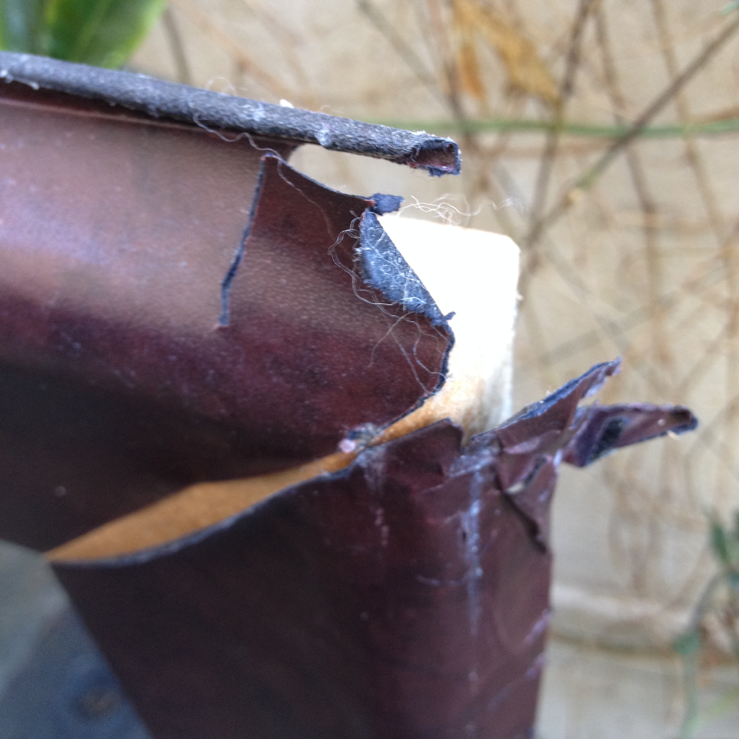 The frame is covered with bonded brown leather which sadly, over the years has begun to peel, rip and look rather tatty. Basically, it’s seen better days.