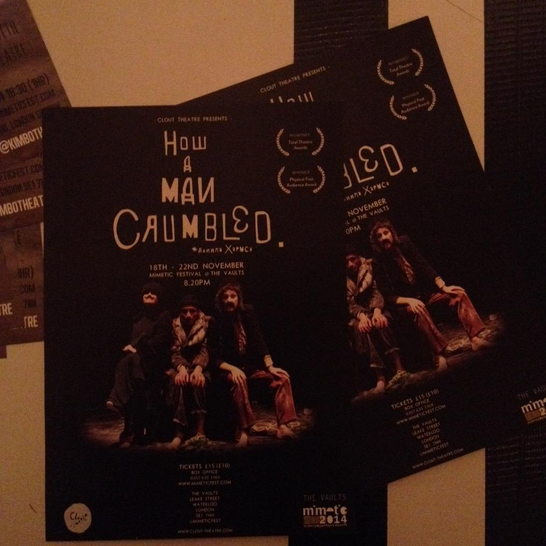 On Tuesday David sneakily bagged himself a +1 press ticket for the show “How a Man Crumbled”. Arm in arm with his old school friend and theatre critic Jess (read some of her reviews here), he headed down in to The Vaults under Waterloo station for the Mimetic Festival.