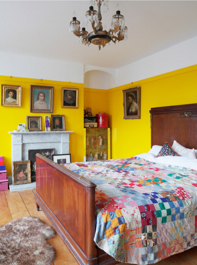For us, it’s this wonderfully vibrant period style room. The bright yellow wall creates a contemporary feel but compliments the wooden floorboards and antique features such as the bed, chandelier and picture frames making it the perfect balance of new and old and keeping us both happy, Mark with the pop of colour and David with the vintage touches!