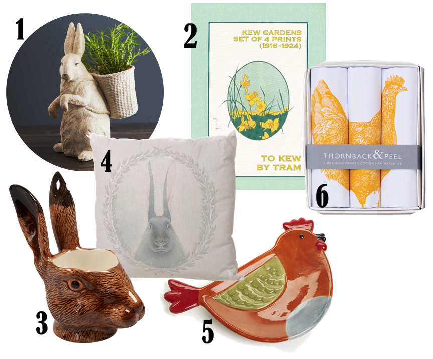1. Planter, £50 from Graham & Green | 2. Kew Gardens Daffodils print, £4.99 from LTM | 3. Hare egg cup, £10.95 from Liberty | 4. Cushion, £50 from Out There Interiors | 5. Tea bag tidy, £2 from Wilko | 6. Hanky Box, £18.50 from Thornback & Peel