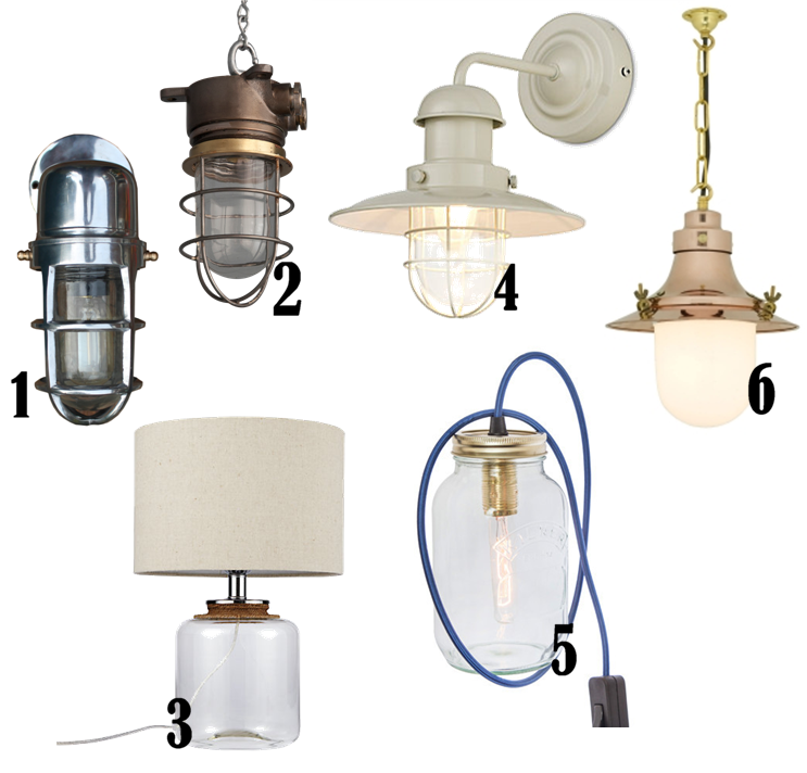 1. Harbourwall Light, £120 from Eclect Design | 2. Pendant Light, £240 from Skinflint | 3. Mablethorpe Glass and Rope Table Lamp, £75 from John Lewis | 4. Schubert Wall Light, £49.50 from M&S | 5. Kilner Jar Table Light, £60 from The Tab Collective | 6. Small Decklight, £335 from Davey Lighting
