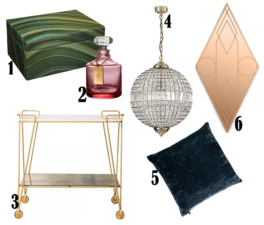 Think golds, marble, drinks trolleys and any barware to mix up a martini, or two. Here’s a few things we’ve found to get you’re home looking sharp.