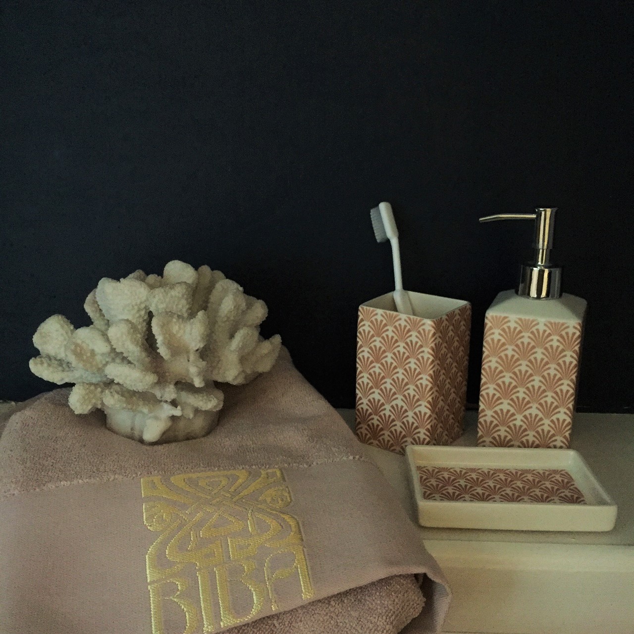 A simple touch of pattern, metallic tones and dusky pinks in these bathroom accessories sit perfectly with our existing ornaments and deep blue wall we previously mentioned – don’t you think?