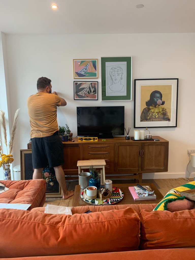 Use your spirit level to stop anything going too wonky and use your tape measure to get fairly even gaps. With that said, we weren’t too precious with this. Trust us, you’ll get a good sense of how it’s looking. Just take your time and step back after each time you put up a piece of art to see how it’s looking. If you need to move something or do it again, then do. You’ll cover up the last hole with a piece of art so don’t fret!
