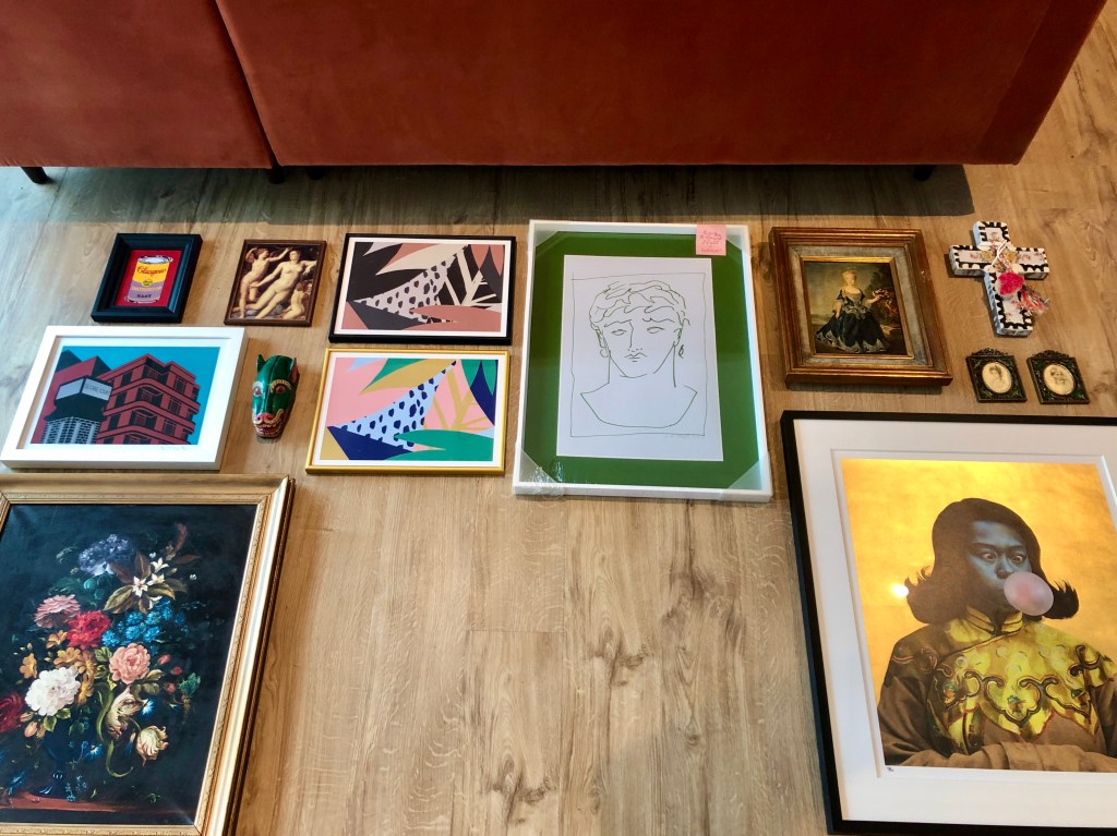 We found that it was easier to place the larger pieces first and work around with the smaller ones. We have three larger statement prints so, to avoid a headache, these were the first to go down. Then we sorted the art in terms of size to fit into different spaces. At the same time, we mentally cross-referenced the colour palettes so it would make a statement on the wall, without being too hap-hazard. Lastly, we took an all-important photo of the finished layout, so we wouldn’t forget!